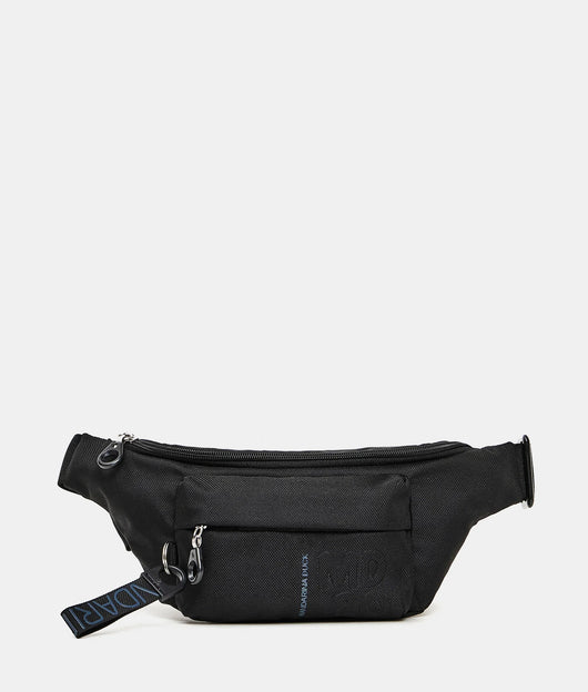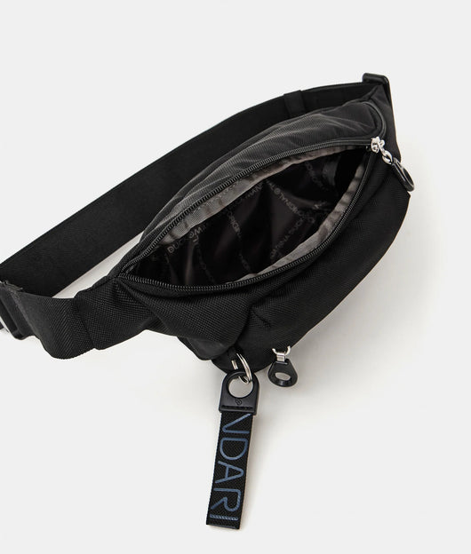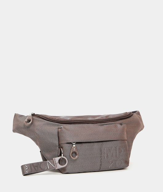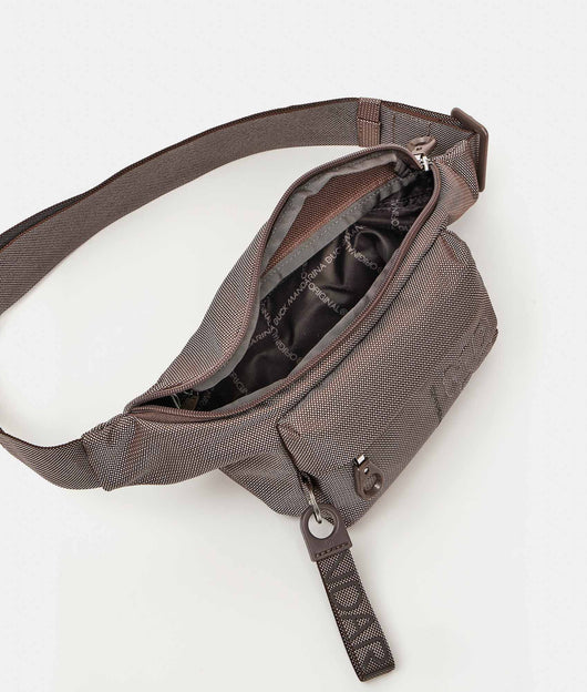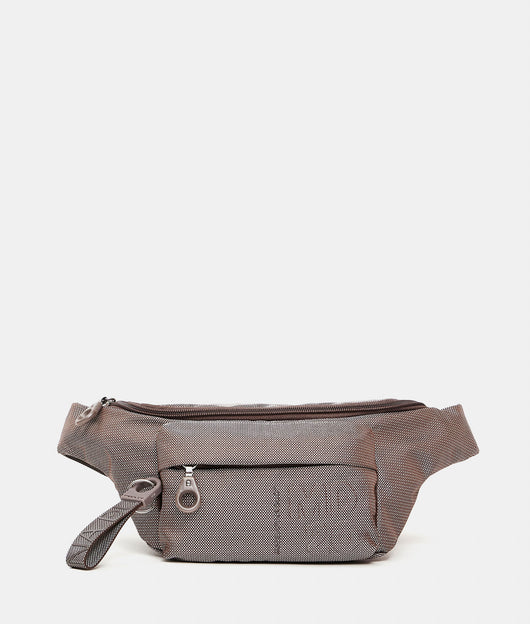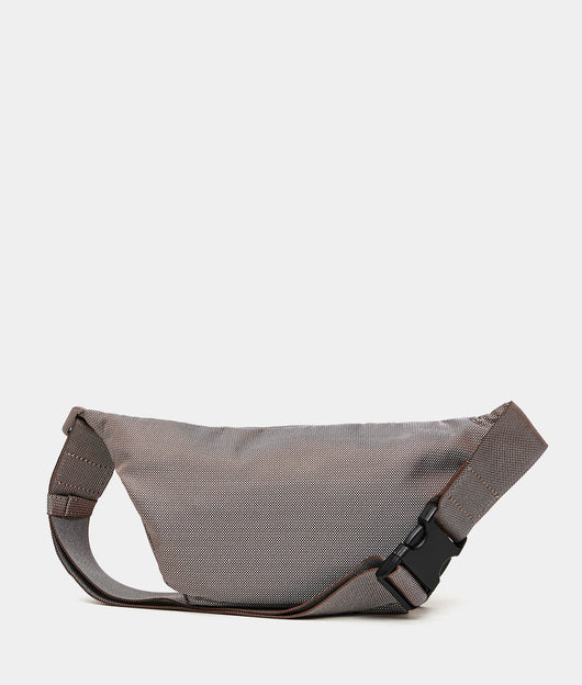 Marsupio con tasca frontale con zip in tessuto. Doppia portabilità, dettagli personalizzati e tracolla regolabile in jacquard, chiusura con fibbia.