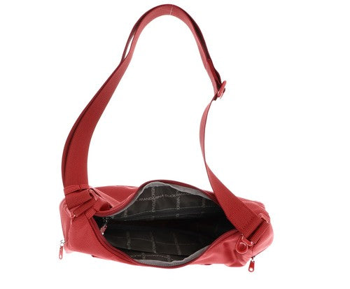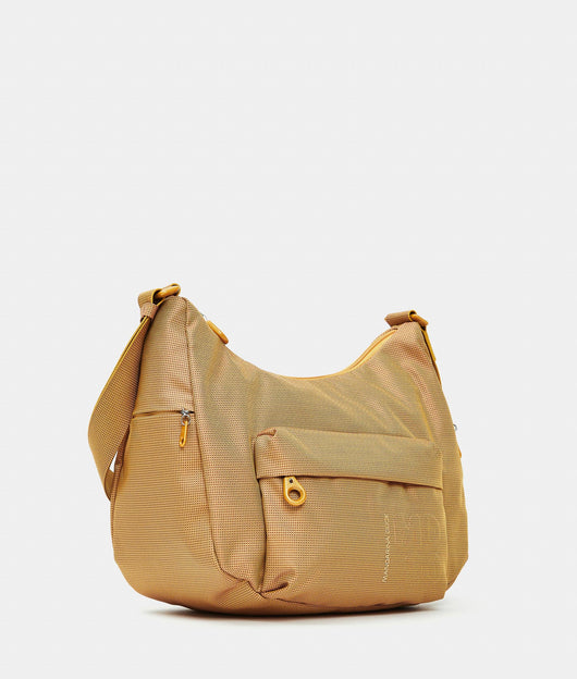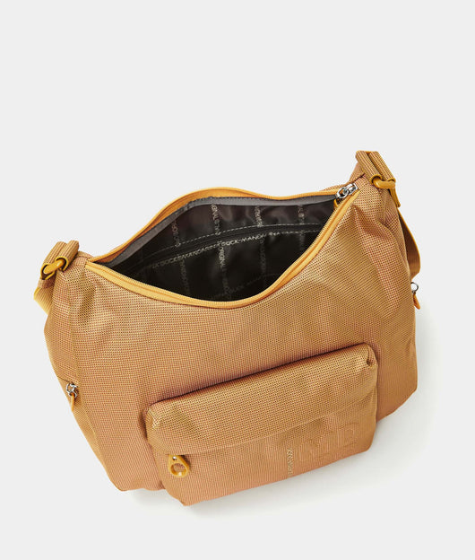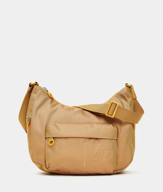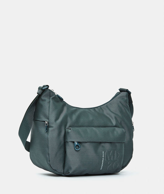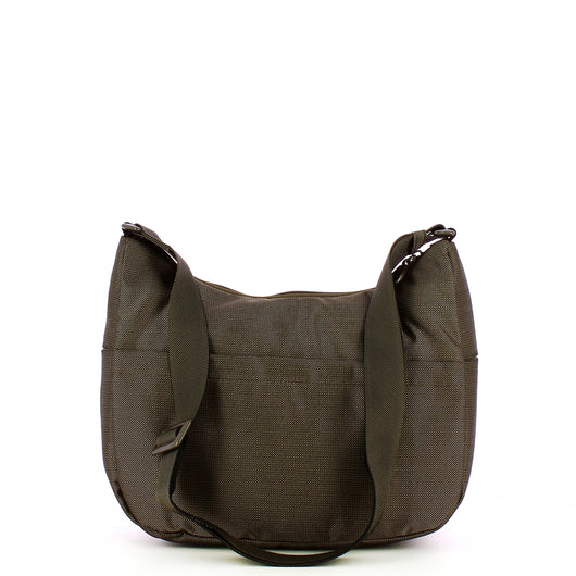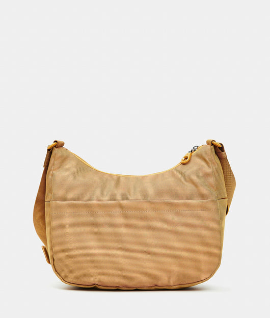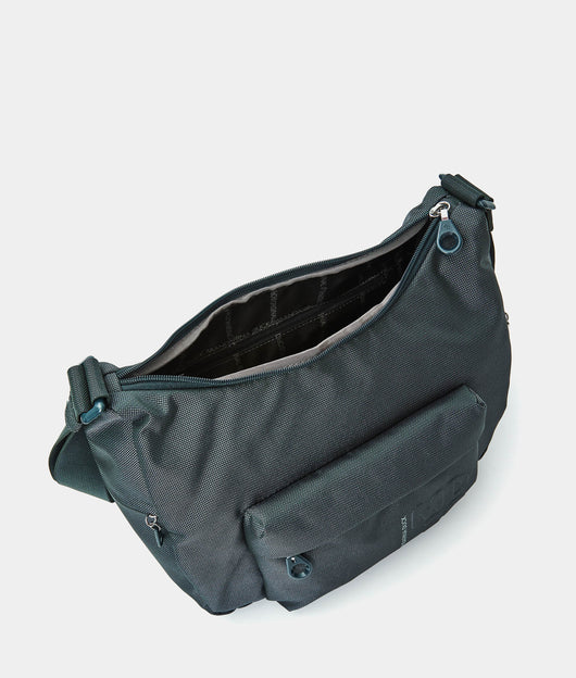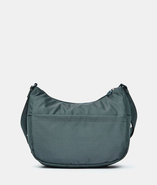 Borsa a tracolla media con tasca frontale e zip in tessuto. Doppia portabilità, tasche smart frontali e interne, dettagli personalizzati e tracolla regolabile in jacquard.